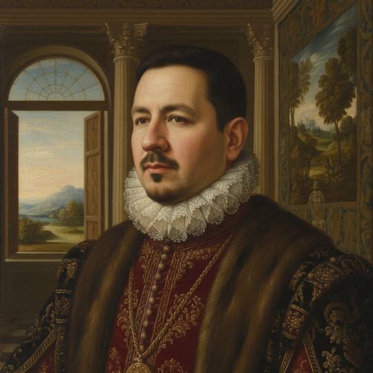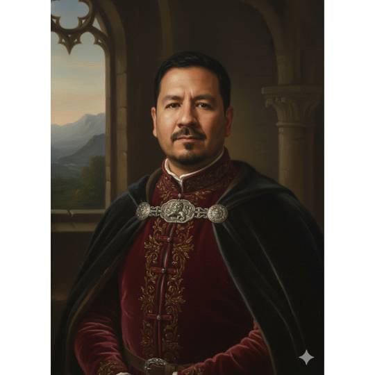 “Retrato histórico tipo pintura del Renacimiento: fondo de palacio, vestimenta siglo XVI con detalles reales.