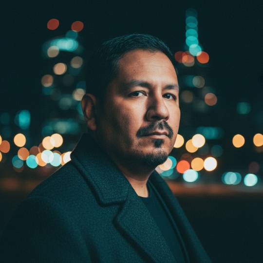 Estilo: tono dramático, iluminación de contorno (rim lighting), encuadre cinematográfico de 50 mm, ligero grano de película y corrección de color en tonos teal y naranja.