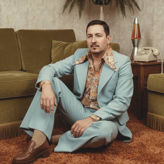 “Fotografía vintage de 1970 en colores desaturados: aparezco con ropa retro (pantalones de bota ancha, camisa de cuello largo) en una sala de estar antigua. Mantener mi rostro fiel, como si la foto hubiera sido tomada en esa década.”